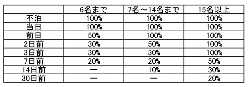 | 2.団体(7名以上)の一部について契約の解除があった場合、施行日の10日前(その日より後に申し込みをお受けした場合には、そのお受けした日)における解除人数の該当%を収受します。 | |